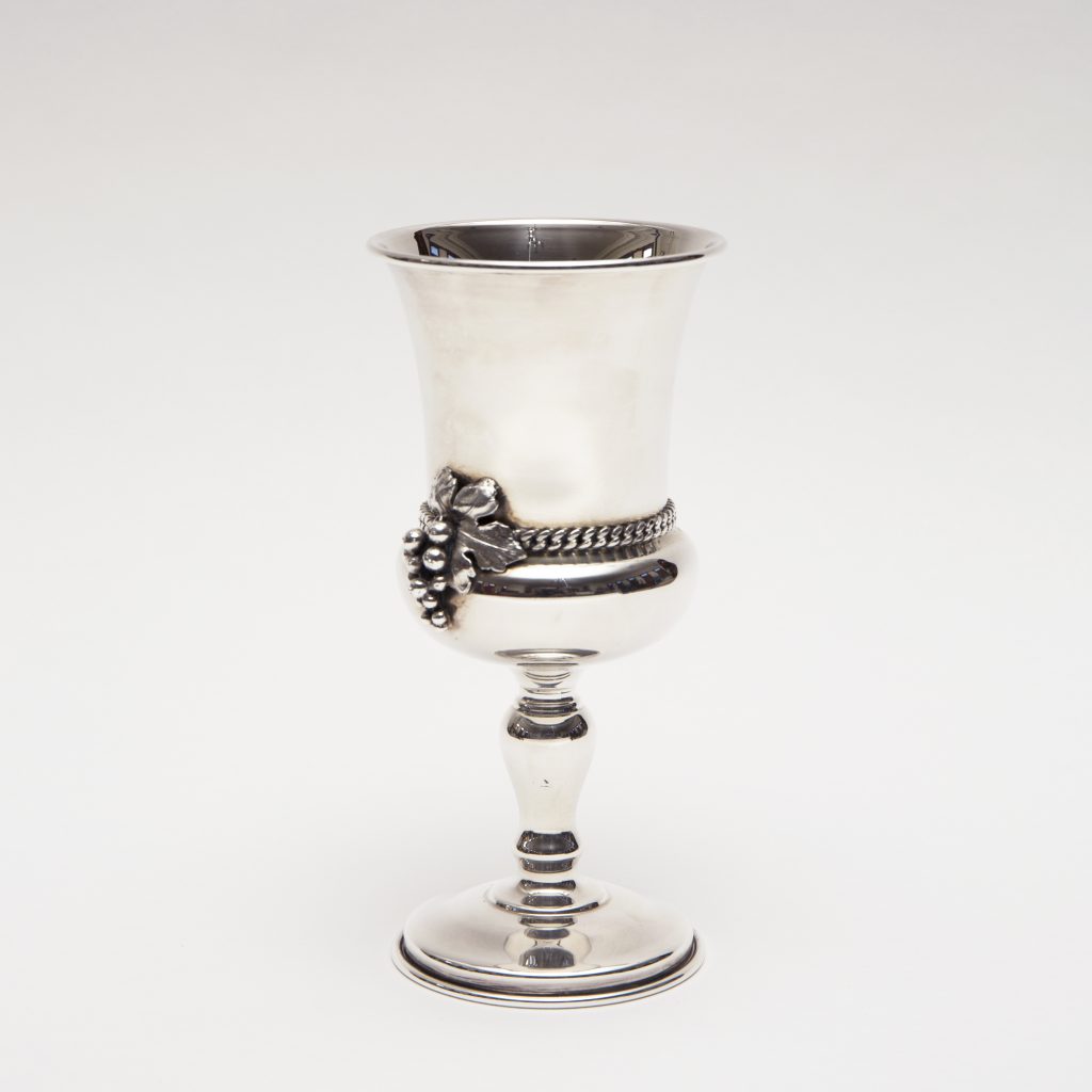Kiddush Cup This very large and beautiful Kiddush cup is composed of sterling silver and measures 7 1/2 inches tall, 3 1/2 inches wide at the top. Around one side of the cup is a decorative band of silver grapes. On the bottom of the cup is the following inscription, "Rabbi Arthur Oleisky, with love and admiration on your silver anniversary, as spiritual leader, of Congregation Anshei Israel, Jan. 13, 1996." The cup has great meaning to me as if was a gift from the congregation. It stands with a spice box and a candle holder for use at Havdalah. -Rabbi Arthur Oleisky