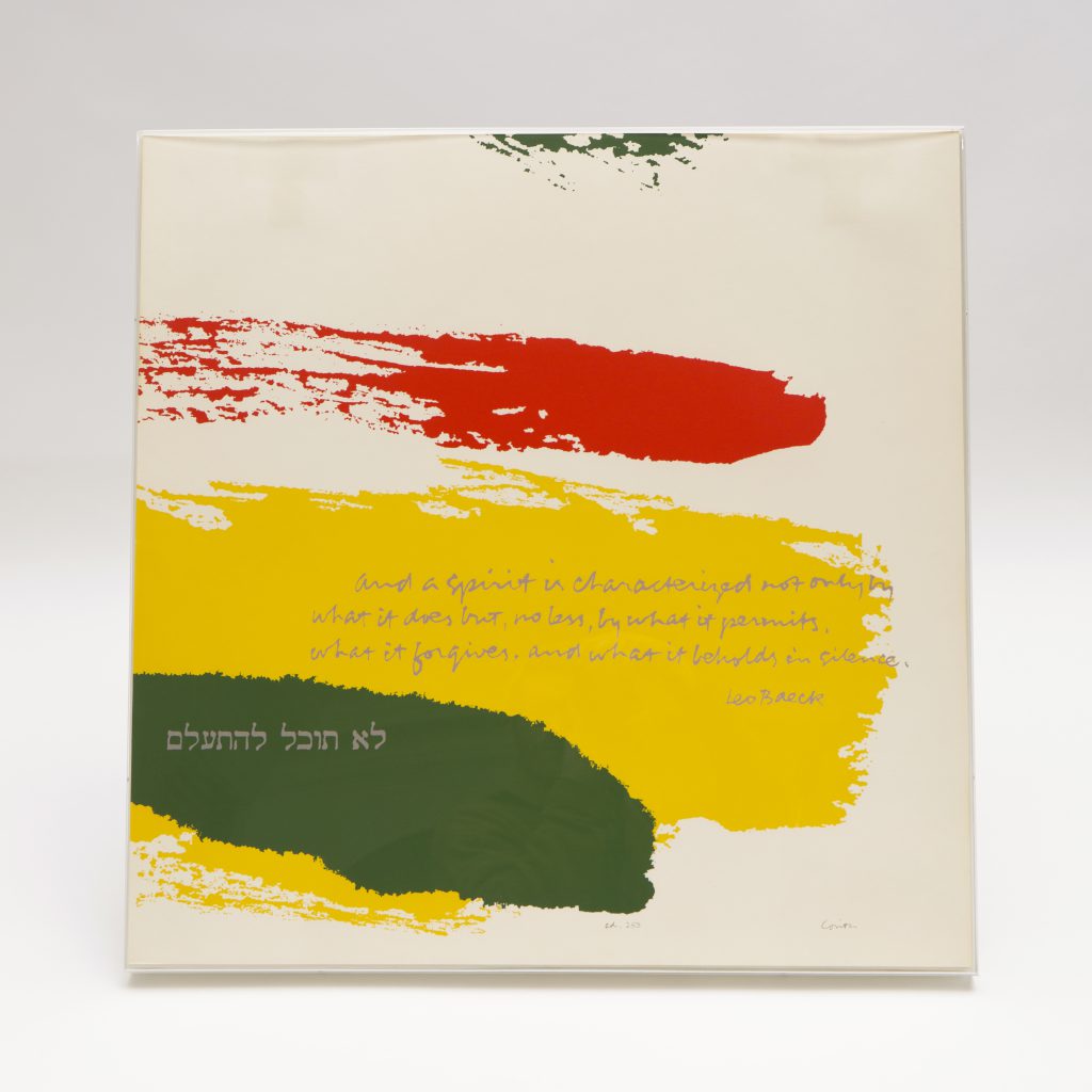 Sister Mary Corita Lithograph Leo Baeck Temple in Los Angeles, commissioned Sister Mary Carita-a Roman Catholic nun and an artist, to create a piece of art for them. She paired Rabbi Baeck’s quote about what embodies the spirit of each individual with a verse from Deuteronomy 22:3, לֹא תוּכַל לְהִתְאַלֵּם, "You must not remain indifferent." An Israeli translated this for me as, "You must not disappear." Rabbi Leo Baeck (1873-1956) refused several opportunities to flee Germany, stating: I will go when I am the last Jew alive in Germany. For those who endured the Holocaust with him at Theresienstadt, Rabbi Baeck was a heroic model of the human capacity to rise above the most degrading experiences. This piece of art is a constant reminder of a rabbi whose decency, compassion, intelligence, courage and gentle manner affirmed a spirit of humanity which continues to inspire and motivate my work in our community. -Rabbi Thomas A. Louchheim