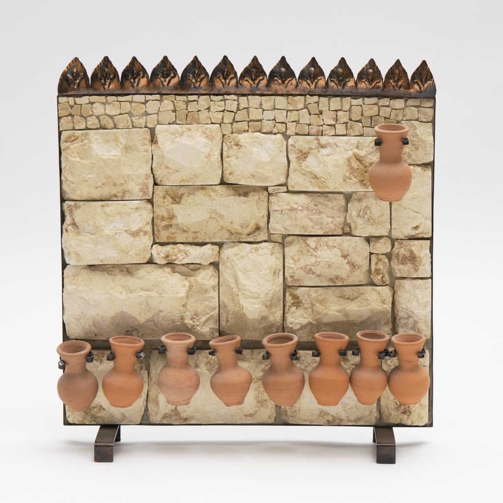 Hanukkah Menorah This Hanukkiah (circa 1969), purchased in Jerusalem and featuring a mosaic of the Kotel, is made out of Jerusalem stone and reflects on the Six Day War post-1967. The essence of Hanukkah is a celebration of the biblical restoration of the Temple and a prayer that it might once again be restored. By choice, the Eisen family has never used this Menorah-seeing it not as an art piece, but as a symbol of what might yet be, as our family hopes and waits for the day when there is peace and Israel fulfills its role as Reishit Tzimchat Ge'ulateinu, or the flowering of our redemption. -Rabbi Robert Eisen